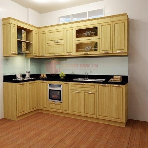 – Chiếc tủ bếp gỗ sồi mỹ được thết kế với kiểu dáng chứ L đem đến không gian rộng rãi và thoải mái cho phòng bếp. Nhìn tổng thể chiếc tủ bếp được chia làm 3 khu rõ ràng bao gồn: khu đun nấu, khu chậu rửa và khu bày biện trang trí.