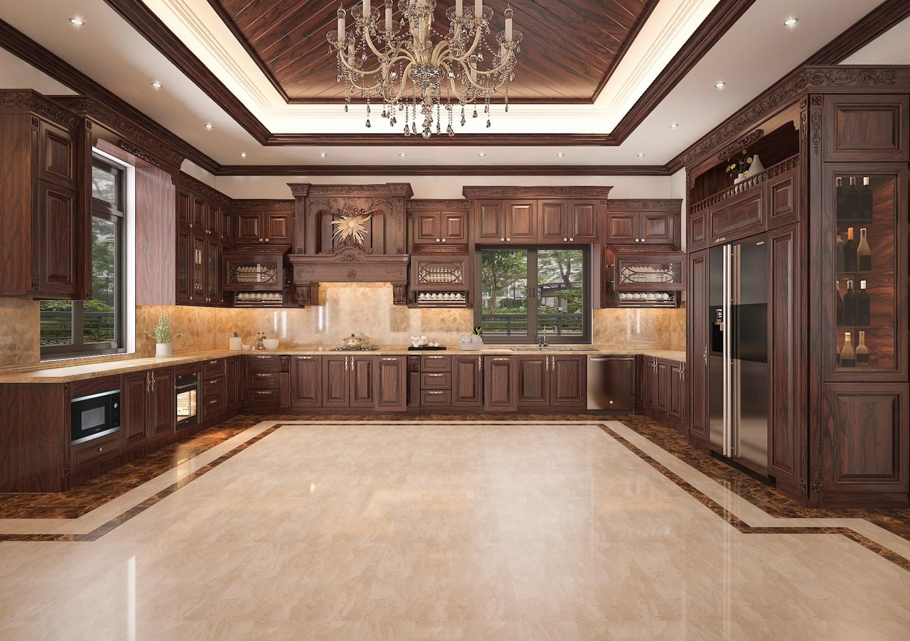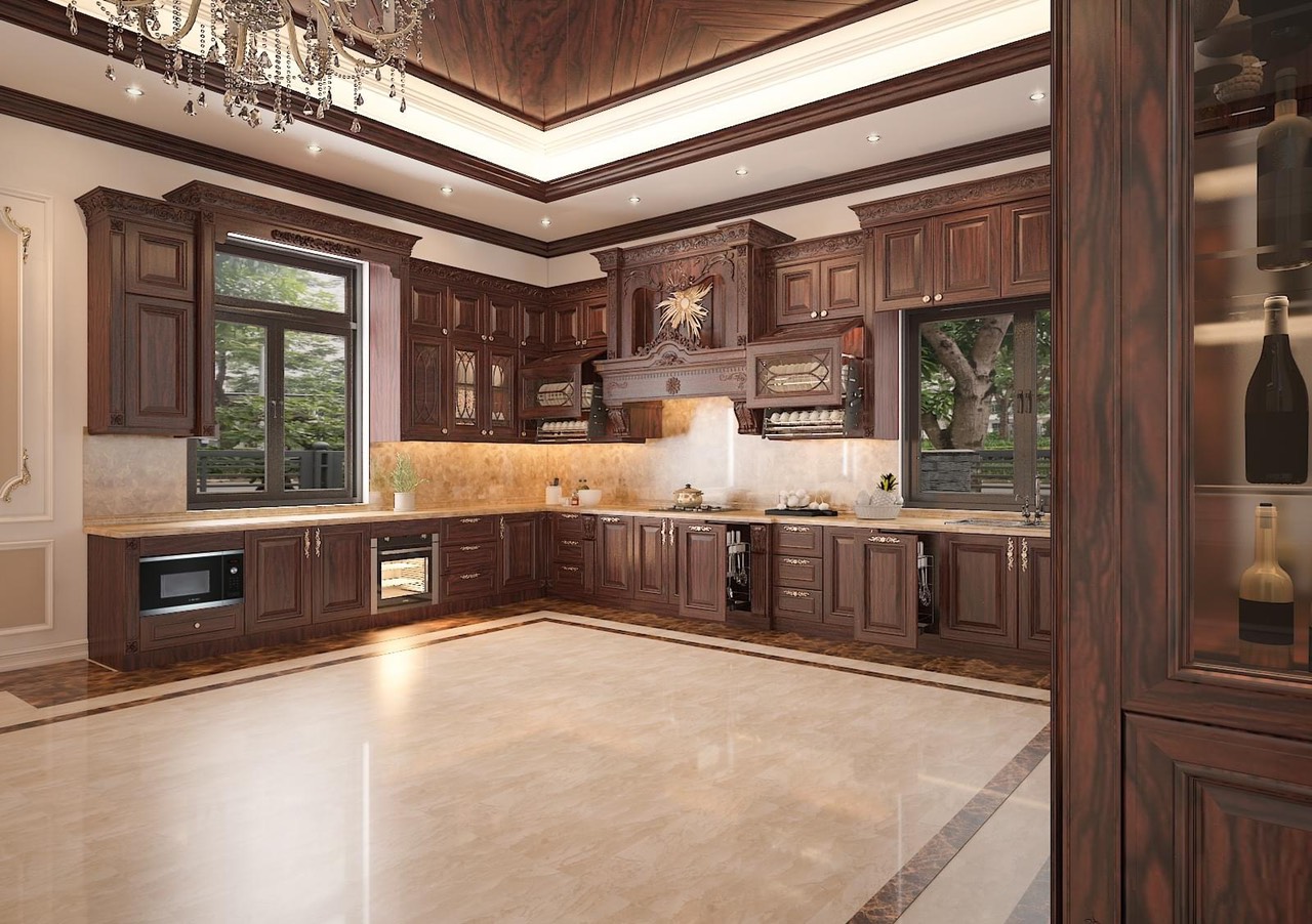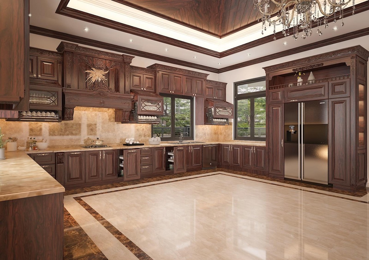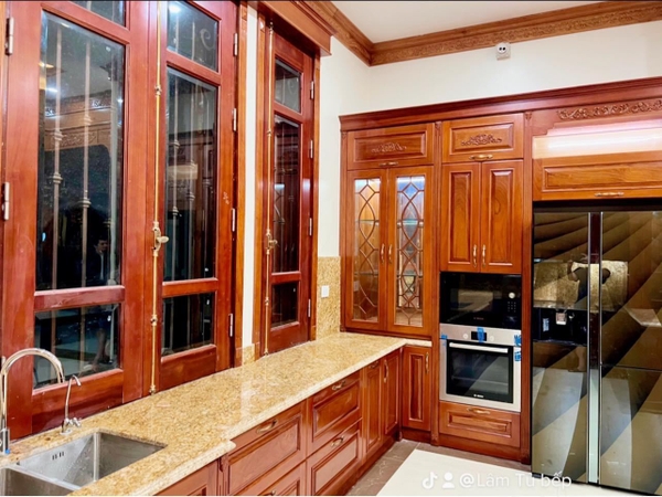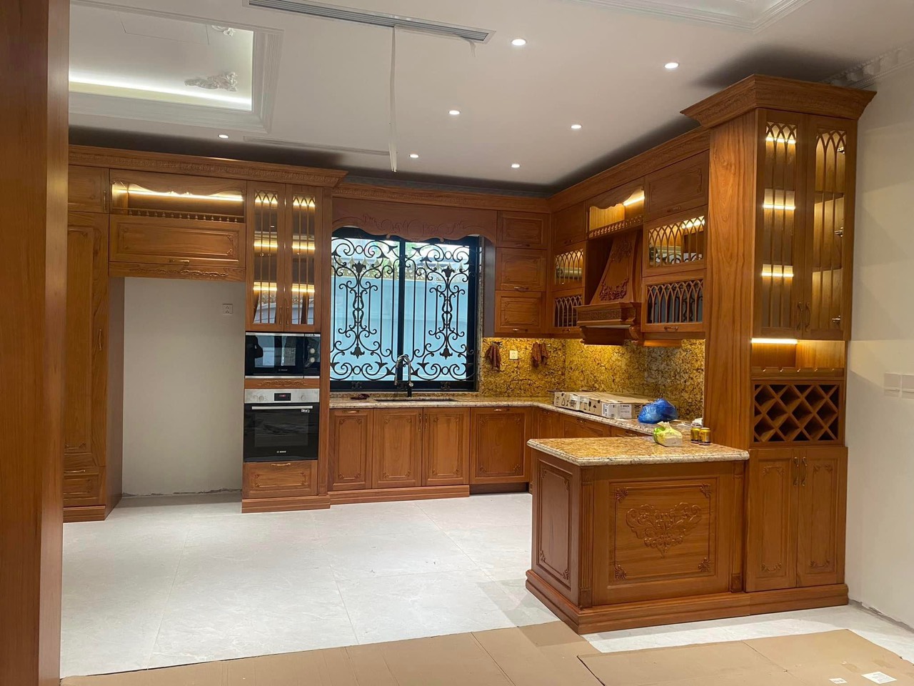 " Hoàn thiện bộ tủ bếp gỗ gõ đỏ Pachy kiểu dáng tân cổ điển nhà Chú Cảnh - Vĩnh Yên - Vĩnh Phúc, công trình thực tế "