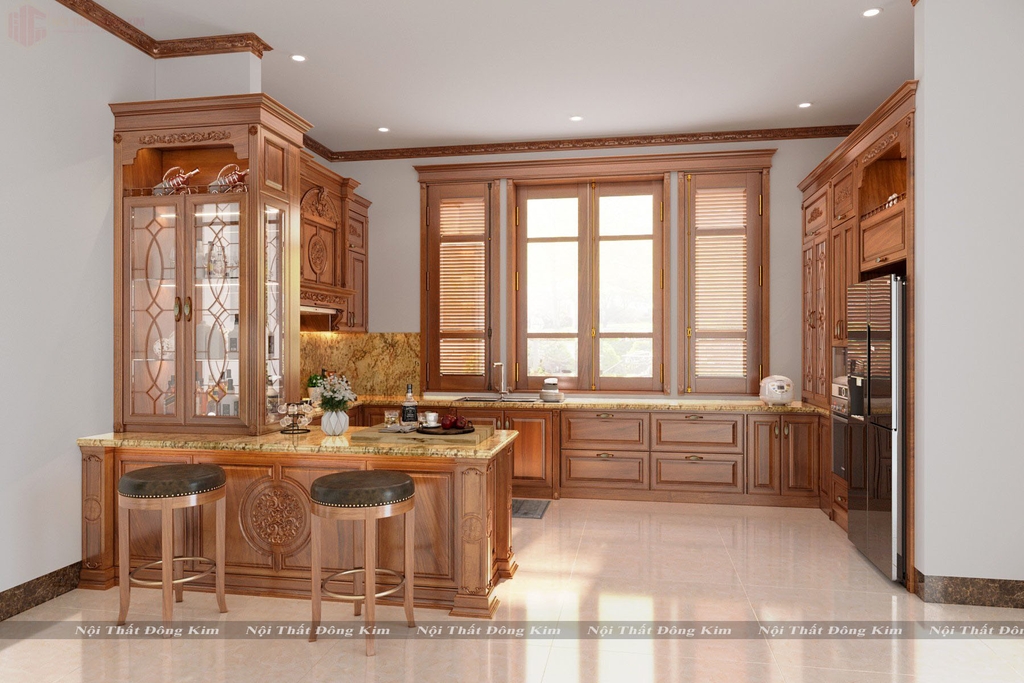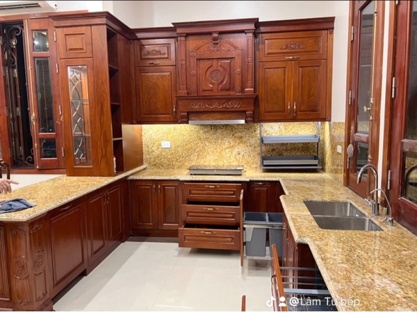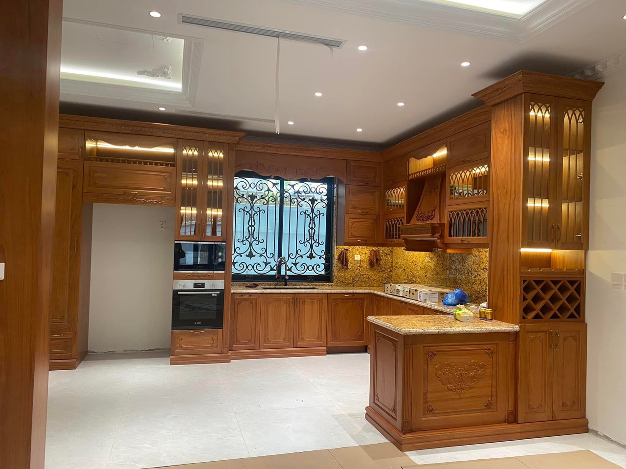 " Hoàn thiện bộ tủ bếp gỗ gõ đỏ Pachy kiểu dáng tân cổ điển nhà Chú Đông - Đông Anh - Hà Nộii, công trình thực tế "