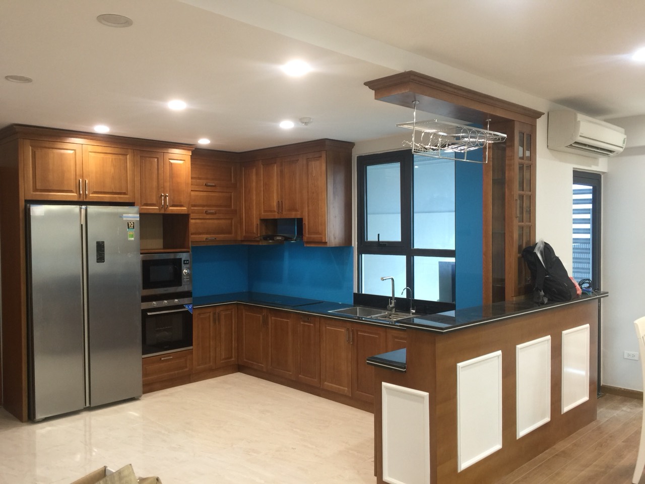 – Màu vàng nhạt của gỗ sồi mang lại sự trẻ trung, hiện đại cho căn bếp. Đặc biệt là mặt kính ốp bếp màu cam kết hợp với ánh đèn tạo điểm nhấn sang trọng.