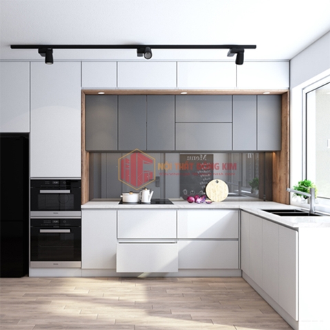 – Tủ bếp laminate TBLM được thiết kế nhỏ gọn theo kiểu dáng chữ L tận dụng tối đa góc tường bếp để mang đến nhiều hơn không gian sử dụng cho người nội trợ và gia đình. Do có diện tích nhỏ hẹp nên KTS đã lên phương án phối màu tủ bếp trên màu trắng vừa sạch sẽ và tạo cảm giác thông thoáng, rộng rãi cho căn bếp. Kết hợp với tủ bếp dưới màu vân gỗ. Như các bạn đã biết bếp dưới là nơi người nội trợ hoạt động chủ yếu cho công việc nấu nướng. Bởi vậy, những vết bẩn dầu mỡ hay từ thực phẩm văn ra nhanh làm bẩn phần tủ bếp dưới. Khi sử dụng màu vân gỗ sẽ có tác dụng che vết bẩn tạm thời khi bạn chưa có thời gian để lau chùi.